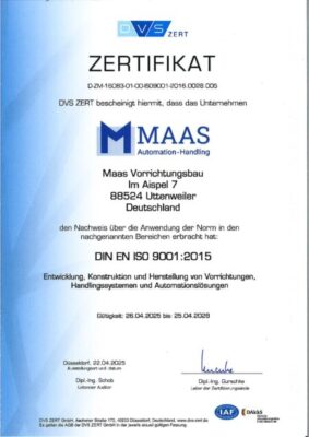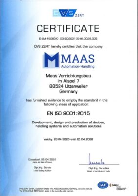 MAAS Vorrichtungsbau entwickelt Lösungen zur Optimierung und Automation kundenspezifischer Anforderungen. Vom einfachen Teile-Handling bis zur vollautomatisierten Anlage oder Zelle findet unser Know-how Anwendung in den unterschiedlichsten Branchen. Um den kompletten Fertigungsprozess und die Qualitätsanforderungen sicher zu stellen, fertigen wir darüber hinaus Montage- und Prüfsysteme.